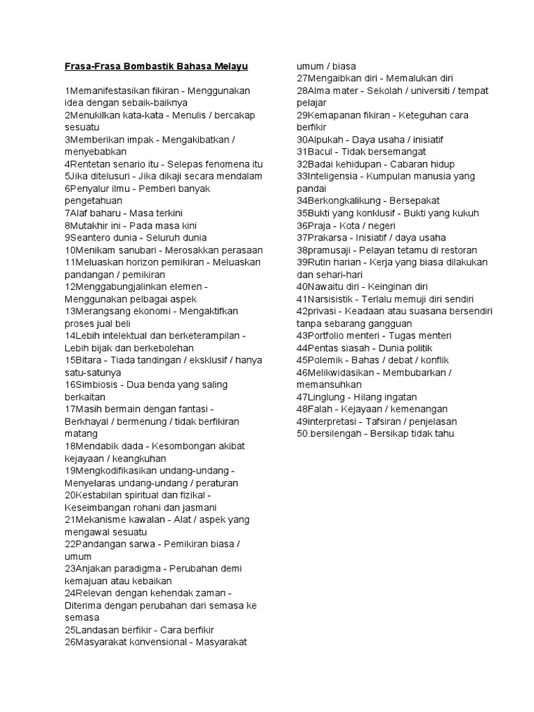 Frasa Frasa Bombastik Bahasa Melayu from imgv2-2-f.scribdassets.com Apakah perkataan saudara menyakiti atau membina orang lain? Perkataan ialah unit bahasa yang membawa erti dan terdiri dari satu atau lebih morfem yang saling diikat rapat, serta membawa nilai fonetik. Assalamualaikum ^_^ kelab bahasa melayu smkjeram nak share beberapa perkataan bombastik hedonisme : Kita semua sedia maklum yang bahasa melayu ni ialah bahasa kebangsaan negara kita. Gunakan tutur kata yang baik sesuai yang yehuwa inginkan. Disini saya ingin kongsikan perkataan bahasa melayu yang jarang didengar dan diguna oleh kita semua. Pokok herba ialah tumbuhan yang dikategorikan sebagai pokok renek berbatang lembut ataupun keras dan. Kami mempunyai banyak idea untuk menulis semula dan cara menggunakannya, menggunakannya secara percuma sekarang!