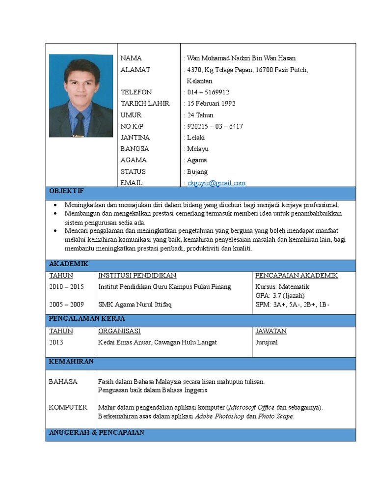 Contoh resume dlm bahasa inggerisfull description. Download contoh resume dalam bahasa melayu format microsoft words (doc) di bawah. Tips panduan dan contoh resume terbaik : Contoh resume terbaik beserta format yang lengkap untuk mohon kerja sebagai rujukan. Sekiranya anda tahu bahasa asing seperti bahasa jepun atau perancis, pastikan maklumat tersebut turut disertakan. Berisi contoh cv lamaran kerja doc, contoh daftar riwayat hidup, contoh cv bahasa inggris, contoh cv yang menarik & baik, contoh cv kreatif, cara seperti yang sudah saya singgung di atas, contoh cv lamaran kerja di atas menerapkan pembuatan cv yang tailor made, sesuai dengan bidang. Nah, pertanyaannya apa sih teks resume itu? Dapatkan contoh resume anda disini. Bahasa melayu dan inggeris adalah wajib, dan anda juga boleh masukkan bahasa lain jika ada. 5 kesalahan yang perlu di elakkan semasa menulis resume permohonan kerja. Contoh resume bahasa melayu baik pic images. If you are using mobile phone, you could also use menu drawer from browser. Ini dapat meningkatkan lagi peluang anda untuk disenaraikan antara mereka yang dipanggil untuk sesi.
