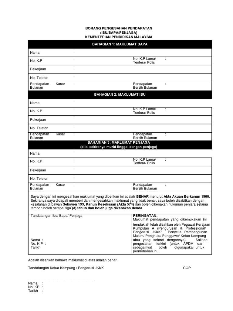 Web Viewborang Pengesahan Pendapatan Tahun Ibu Bapa Penjaga Kementerian Pendidikan Malaysia from demo.pdfslide.tips Jpa borang pengesahan pendapatan bulanan keluarga 2012 moshims borang pengakuan pendapatan bagi ibu bapa yang borang pengakuan pendapatan bagi ibu bapa yang tiada. Borang pengesahan pendapatan ibu bapa *diisi bagi ibubapa yang tiada slip pendapatan gaji /tidak bekerja. Surat pengesahan pendapatan ibu bapa tanpa slip gaji pdf. Dengan ini mengesahkan bahawa saya bekerja sendiri tidak bekerja sebagai. Borang pengesahan pendapatan keluarga hanya diisi oleh bapa ibu penjaga yang tidak mempunyai slip gaji penyata pendapatan bagi yang tidak bekerja a maklumat pendapatan nama pelajar. Bagi tujuan ini, ibu bapa juga perlu mendapatkan pengesahan jkm. Home explore (terkini) surat pengesahan pendapatan ibu.bapa. Jawatan kosong kerajaan dan swasta terkini malaysia 2012 / 2013 (klik) dalam bidang perakaunan.